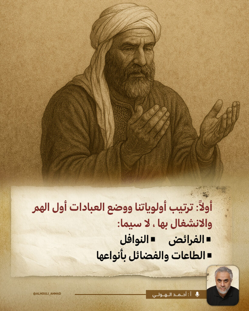 أولاً: ترتيب أولوياتنا ووضع العبادات أول الهم والانشغال بها ، لا سيما: • الفرائض • النوافل • الطاعات والفضائل بأنواعها