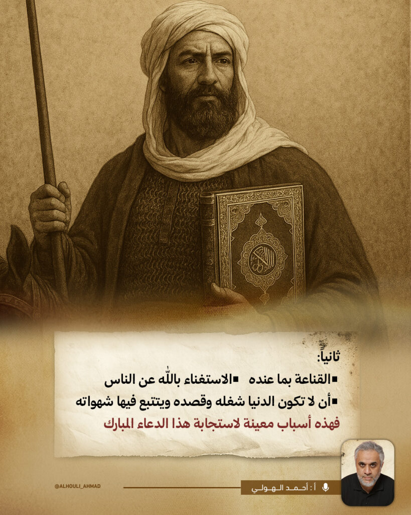 ثانياً: • القناعة بما عنده • الاستغناء بالله عن الناس • أن لا تكون الدنيا شغله وقصده ويتتبع فيها شهواته فهذه أسباب معينة لاستجابة هذا الدعاء المبارك